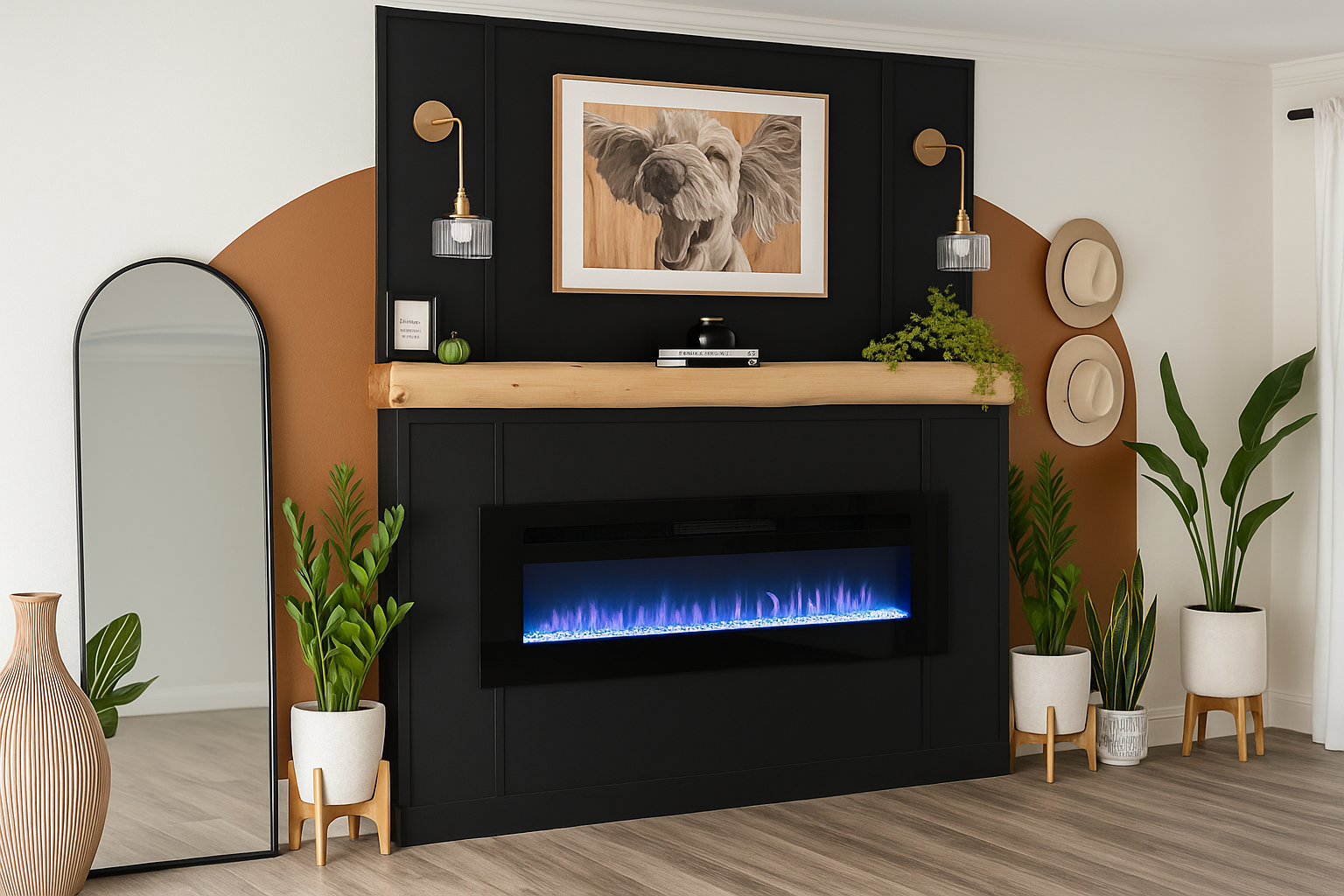 full fireplace surround build out, wood trim, (fireplace & wall), painted arch wall mural
